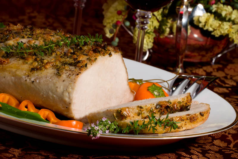 4. Se bagă în cuptorul încins în prealabil şi se lasă să se pătrundă bine. Muşchiul se stropeşte cu sosul din tavă. Se serveşte ornat cu cimbru proaspăt şi cu diferite garnituri.