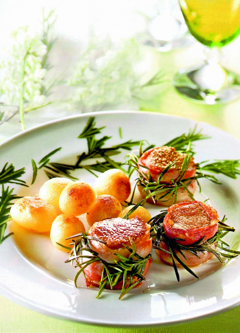2. Se înfăşoară apoi fiecare bucată de carne în câte o felie de bacon şi se leagă cu aţă de jur împrejur. Se aşază apoi într-o tavă, se stropesc cu vin şi ulei de măsline şi se coc în cuptorul bine încins timp de 30 de minute.