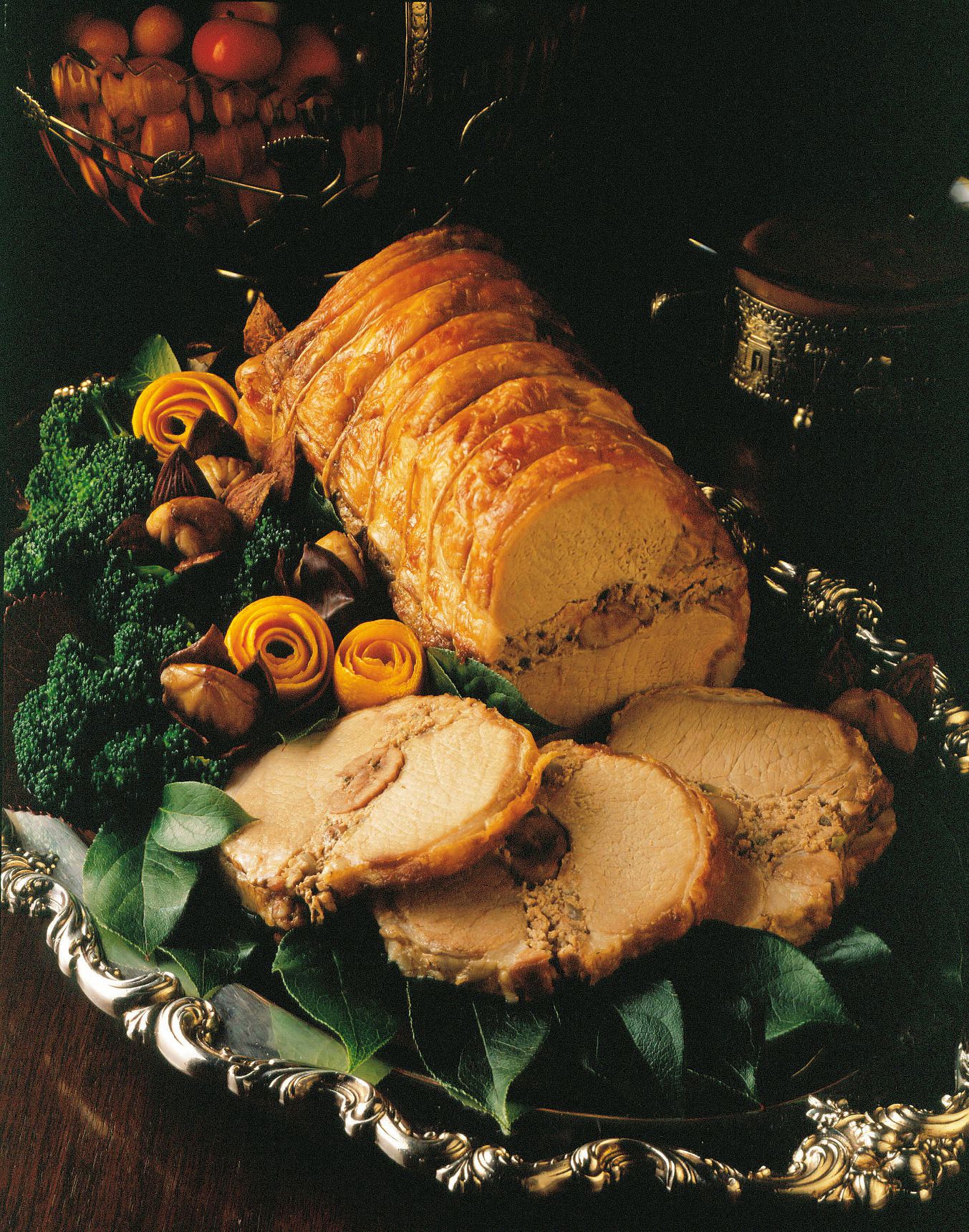1. Muşchiul de porc se spală, se curăţă de pieliţe şi se taie pentru a putea fi umplut. Se condimentează cu sare şi piper, iar la interior se unge cu muştar. Se lasă la rece 30 minute. Ficatul de pasăre se spală şi se lasă 10 minute în apă rece.