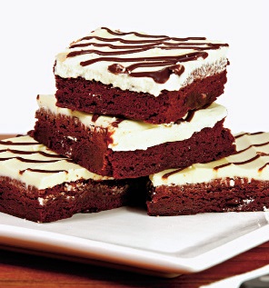 4. În timpul acesta, se freacă gălbenuşurile cu zahărul şi coniacul. Se adaugă vanilia şi crema de brânză. Se scoate foaia din cuptor, se răceşte şi se aşază un strat de cremă pe deasupra. Se întinde uniform şi se ornează cu restul de ciocolată amăruie. Se lasă la rece şi apoi se taie cubuleţe.