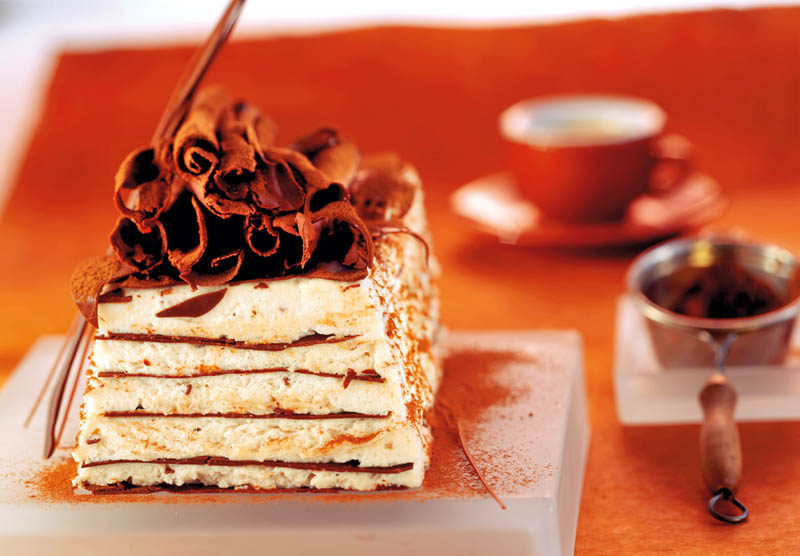 5. Se îmbracă o tavă de cozonac în hârtie de copt, se pune un rând de foi de ciocolată, un rând de îngheţată şi tot aşa până se umple tava, se înfăşoară şi se bagă la congelator încă 2 ore. Când se serveşte, se pudrează cu cacao şi cafea solubilă şi se ornează cu ciocolată.