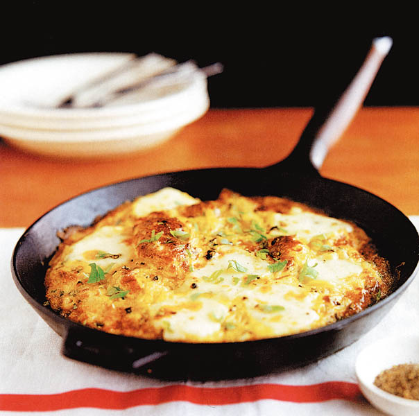 3. Se presară pătrunjel verde tocat, se pliază în două, alternându-se astfel straturi mai rumene, cu straturi mai cremoase. Se serveşte caldă.