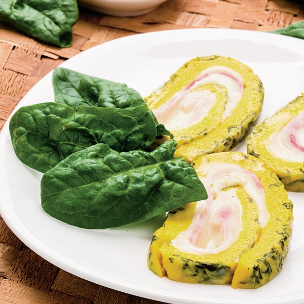4. Se rulează omleta în tigaie şi se mai ţine încă 2-3 minute apoi se scoate. Se lasă 2 minute după care se taie şi se serveşte. Se poate orna cu frunze crude de spanac.