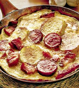 4. Cu 10 minute înainte, se pun ouăle bătute cu brânza şi, după ce s-au rumenit pe o parte, se răsucesc uşor, ca să nu se rupă. Omleta de cartofi se serveşte caldă cu diferite sortimente de salate.