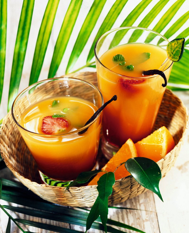 1. Se curăţă portocalele şi se storc, la fel se procedează şi cu lămâia. Se amestecă bine ingredientele lichide, apoi se toarnă în pahar. Se decorează cu căpşune şi cu frunze de mentă. Recomandat diabeticilor.