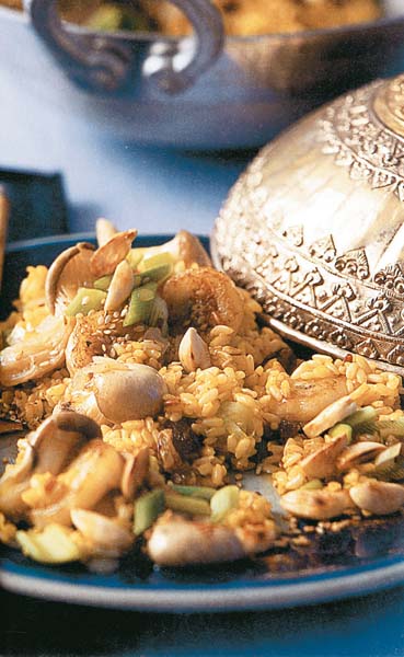 3. Se pune orezul şi se adaugă o cană de apă fierbinte. Se condimentează cu sare şi piper, se acoperă şi se ţine la foc mic până se înmoaie orezul. Se adaugă susanul şi alunele prăjite.
