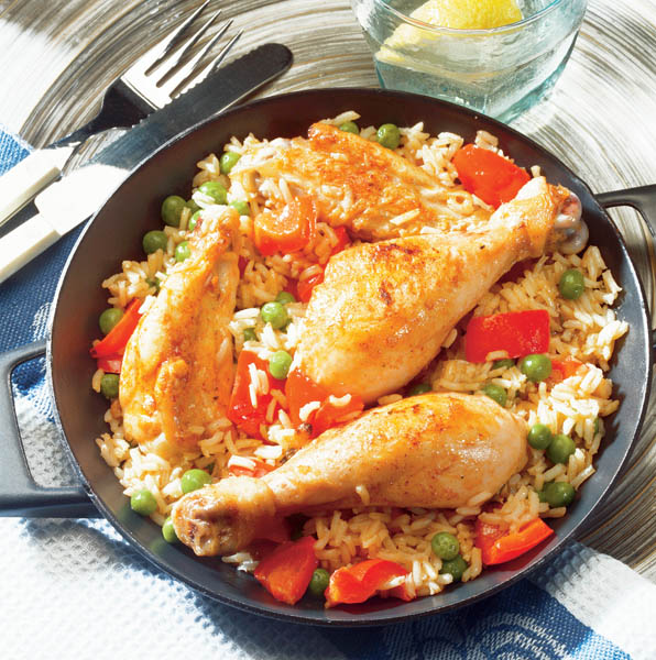 3. Se adaugă ardeiul gras tăiat cubuleţe şi mazărea, se amestecă puţin şi se pune în cuptorul încins, la foc potrivit, 10-15 minute. Se mai poate adăuga puţină supă sau apă, dacă orezul a absorbit tot sosul.