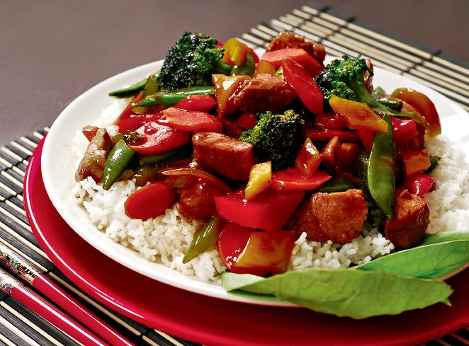 - Carnea de porc se taie cubuleţe, se căleşte, separat, în puţin ulei, şi se lasă să se prăjească la foc mic, să nu se ardă şi să se pătrundă uniform. După ce s-a rumenit, se adaugă sosul de soia şi pasta de ardei. Se mai lasă câteva minute şi se ia de pe foc. Pe un platou, se pun orezul, legumele şi carnea şi se ornează cu frunze de salată.