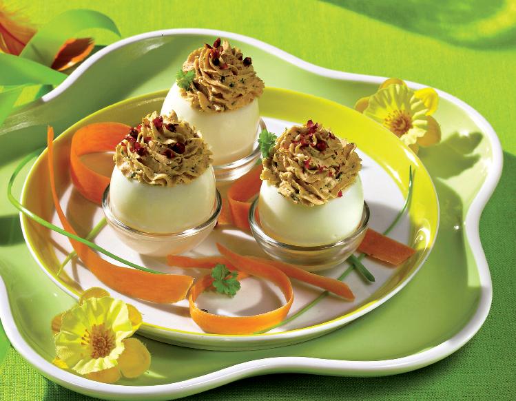 - Compoziţia se condimentează cu sare, piper şi muştar şi, cu ajutorul unui poş cu şpriţ, se umplu ouăle. Se ornează cu bobiţe de piper roşu, ardei roşu tocat mărunt, frunzuliţe de pătrunjel verde şi fâşii de morcov.
