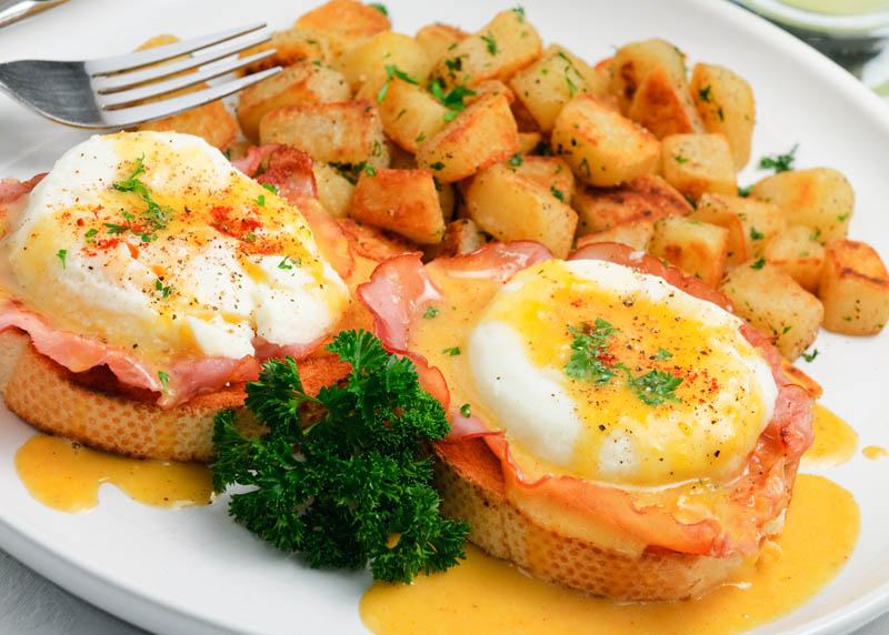 5. Se ornează feliile de pâine cu caşcavalul şi baconul rumenite şi, deasupra, se pun ouăle. Se servesc cu garnitură de cartofi ţărăneşti şi se ornează cu pătrunjel.