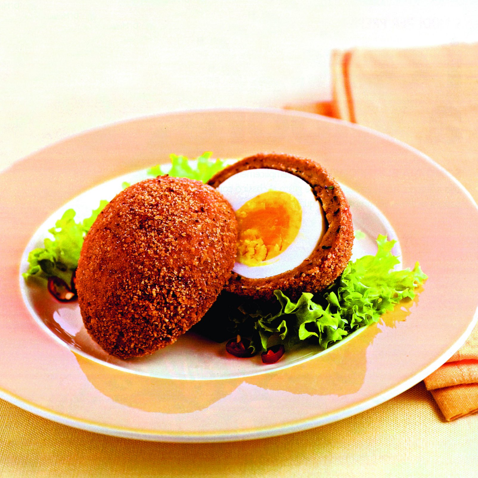 4. Se pun ouăle la prăjit în baie de ulei încins, timp de 5 minute, apoi se scot pe hârtie absorbantă şi se lasă să se scurgă de ulei. Se servesc calde, pe frunze de salată proaspete.