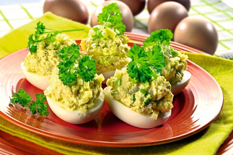 7. Din această compoziţie se ia cu o linguriţă şi se umplu jumătăţile de albuşuri.