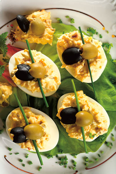 4. Între timp, se spală frunzele de salată, se aranjează pe un platou, se umplu jumătăţile de ouă cu maioneză şi se ornează cu feliuţe de măsline şi fire de ceapă verde.