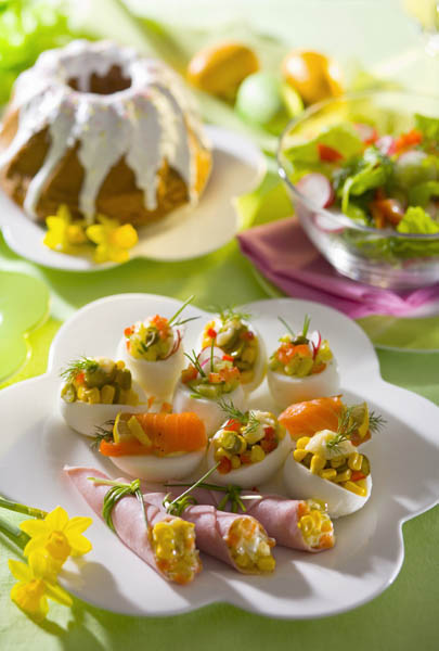 3. Fiecare bucată de ou se unge cu maioneză condimentată cu sare şi piper şi se umple apoi cu porumb, castraveciori muraţi, ridichi şi felii de roşii, rulouri de peşte afumat umplut cu maioneză şi câte o felie de lămâie. Se ornează cu maioneză, ceapă verde şi mărar.