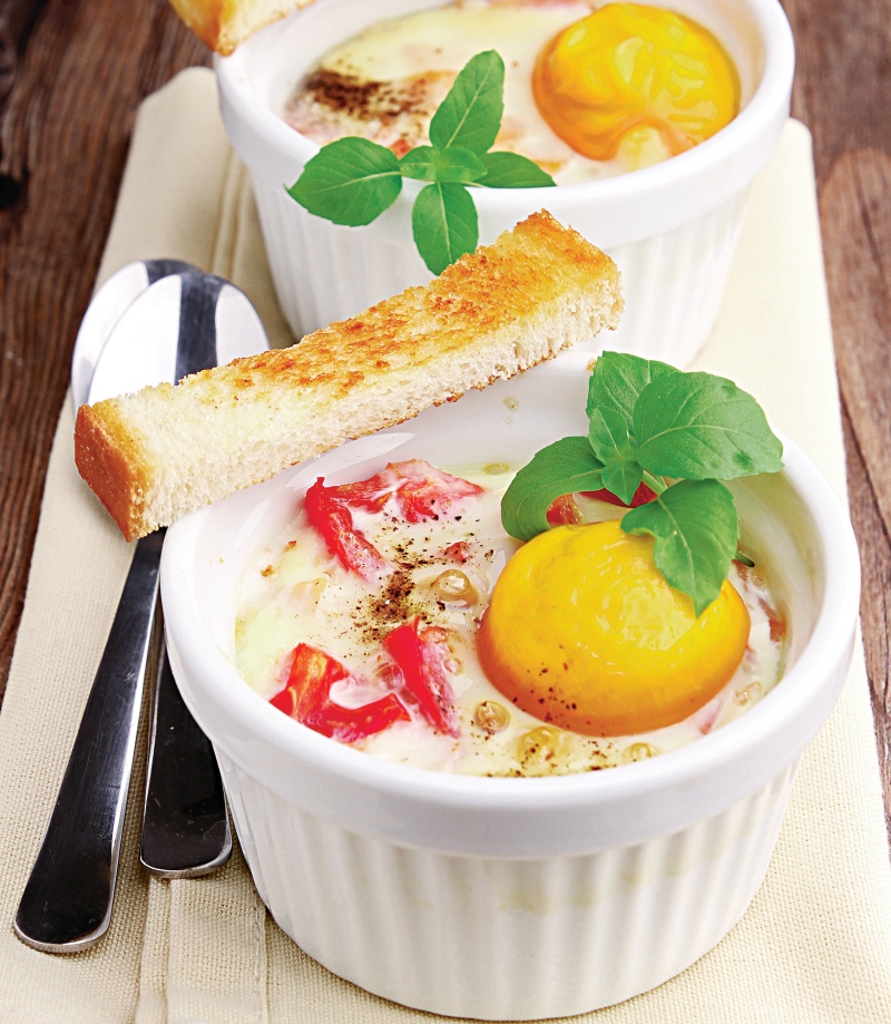 3. Formele se ung cu restul untului, se pun în fiecare câte doua linguri de smântâna, jumatate dintr-o lingura de cascaval, apoi ciuperci cu ardei. Se sparge oul separat pe o farfurioara si, daca este bun, se transfera în forma. Se presara sare si piper si se pune restul cascavalului pe lânga galbenus.