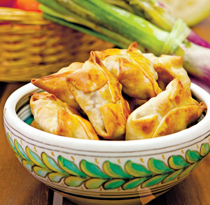 2. Pe o foaie de aluminiu se aşază foaia de plăcintă tăiată şi se pune pe fiecare bucăţică câte o linguriţă de amestec de carne cu legume. Se rulează sau se pliază în triunghiuri.