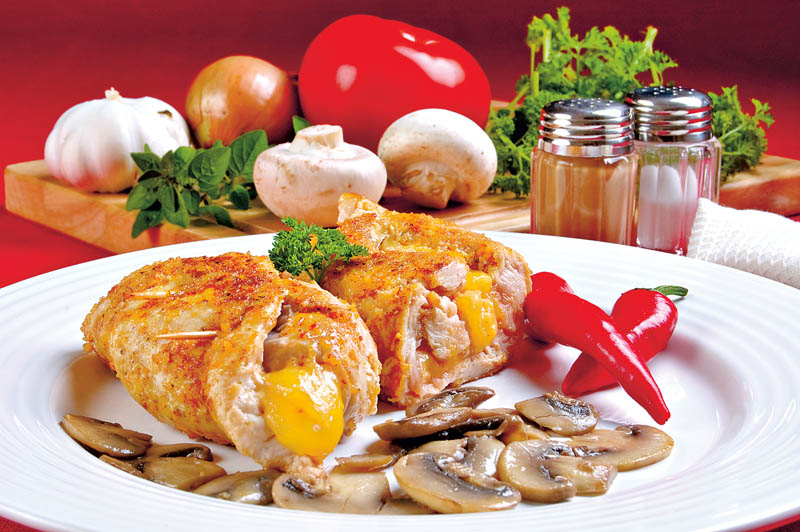4. Se presară bucăţile de piept cu pesmet, se toarnă compoziţia de ciuperci şi se prind cu o scobitoare. Se aşază în tavă şi se bagă în cuptor aproximativ 60 de minute. Se servesc ornate cu pătrunjel verde.