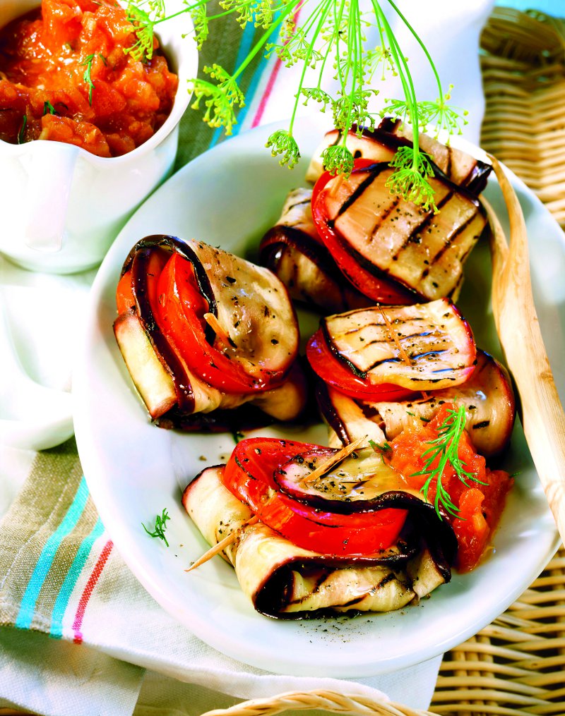 3. Feliile coapte de vinete se aşază în cruce, două câte două. La mijlocul fiecărei perechi, se pune un sfert de ardei iute şi o felie de roşie, se acoperă cu vinete şi se prind cu scobitoare. Fiecare pachet de vinete se unge din nou cu ulei de măsline şi se pune pe grătar, câte 3 minute pe fiecare parte. Când sunt gata, se servesc cu sosul de roşii pregătit dinainte.