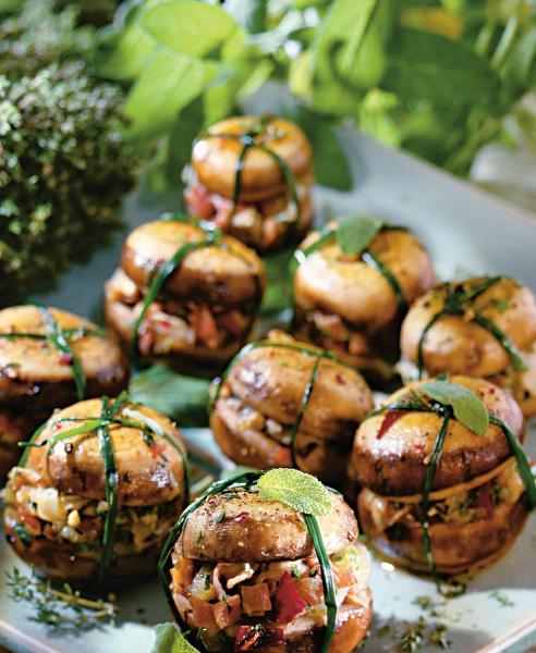 6. Se stropesc cu puţin ulei de măsline, se ornează cu fire de usturoi şi frunze de mentă şi se dau la cuptor pentru aproximativ 15-20 de minute.