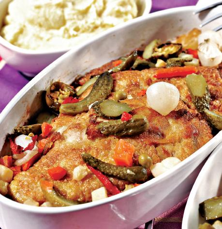 Se tapetează o tavă cu unt şi cu pesmet şi se aşază un rând de vinete pane, șnițel de vită, un rând de castraveciori, arpagic şi morcovi. Se introduce tava în cuptorul încălzit în prealabil şi se lasă să se rumenească. Se servesc cu garnitură de murături asortate.