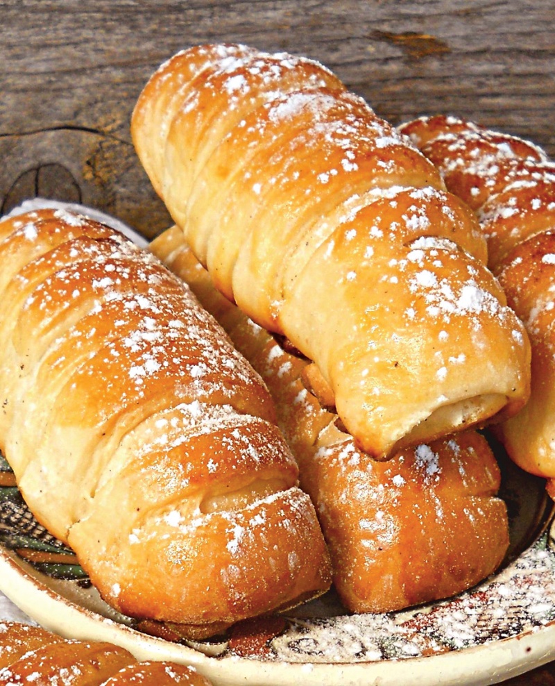 4. Într-o tava tapetata cu hârtie de copt, se pun rulourile unse cu galbenus frecat cu lapte. Se poate presara zahar deasupra. Se coc la foc mic pentru 25 de minute sau pâna se rumenesc frumos, dar atenţie sa nu se arda dedesubt. Se servesc ca atare sau pudrate cu zahar vanilat.