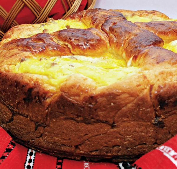 3. Când aluatul a crescut, se pune pe planşeta de lucru şi se împarte în doua. Din una se face o foaie rotunda, care se pune într-o forma de 26 cm, unsa cu unt şi tapetata cu faina. Din cealalta bucata, mai micuţa, se fac trei şnururi. Doua se dau unul peste altul, formând un şnur rasucit, care se pune de jur împrejurul formei rotunde. Cu o lingura se pune umplutura formata din amestecul ingredientelor. Peste umplutura se pune o cruce facuta din cel de-al treilea şnur. Se unge bine cu un galbenuş de ou batut cu câteva linguri de lapte şi se da tava la cuptorul încalzit în prealabil, pentru 45-50 de minute.