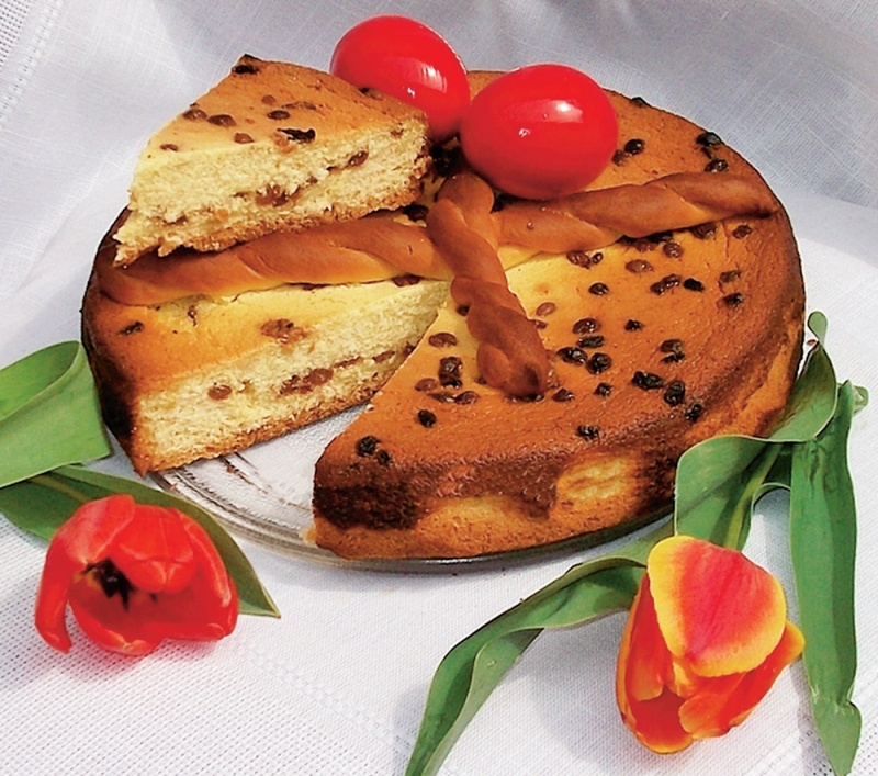 5. Crema de brânza obşinuta se toarna peste aluatul din tava, care se da la cuptor la 180°C. Când începe sa se rumeneasca, se monteaza deasupra crucea facuta din aluatul pus deoparte. Pasca este gata când trece testul scobitorii.