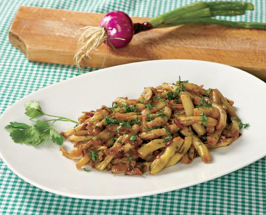 1. Păstăile se spală şi se opăresc în apă cu oţet şi sare, după care se scurg bine. Într-o tigaie cu fundul gros, se încinge uleiul şi se căleşte un pic ceapa, tocată fin.