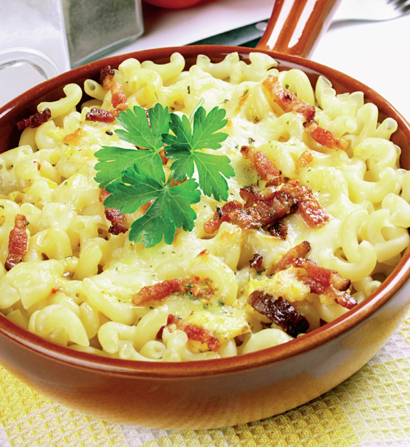 3. Se scurg pastele, se pun peste bacon, se adauga galbenusul si se amesteca energic. Se serveste imediat.