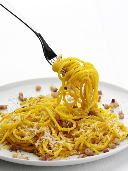 4. Pastele se amestecă cu sosul carbonara şi cu baconul afumat şi se servesc ornate cu frunze de salată.