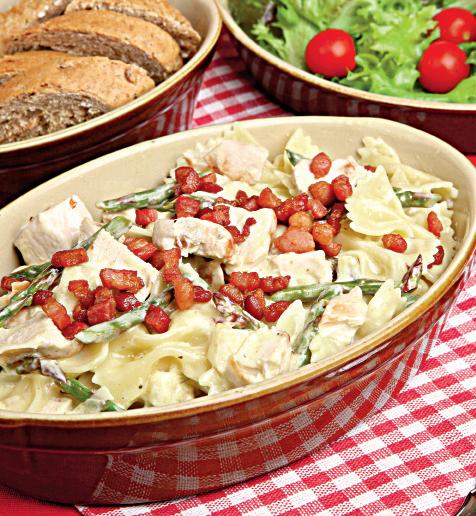 4. Se pun pastele într-un bol şi se amestecă cu sosul bechamel, baconul, caşcavalul şi fasolea fideluţă. Se condimentează cu sare şi piper şi se servesc cu busuioc.