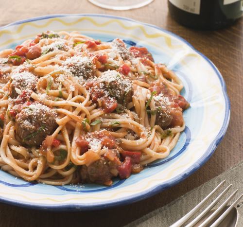 3. Într-o tavă de cuptor se pune o lingură de ulei, se aşază pastele fierte şi scurse, chiftelele, sosul şi se dau la cuptor pentru 15 minute.
