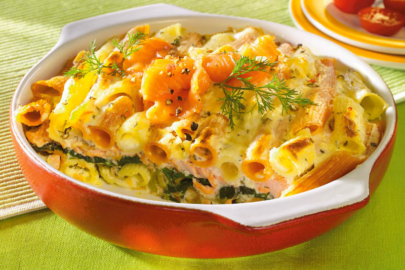 3. Se unge un vas termorezistent cu ulei. Se presară pesmet şi se pune un rând de paste Gata. Se formează apoi straturi cu peşte, spanac şi restul de paste. Se toarnă ouăle bătute cu smântâna, caşcavalul ras, supa de legume, sare, piper şi mărar tocat mărunt. Deasupra se pune peştele afumat tăiat cubuleţe şi parmezanul ras. Se coace în cuptorul încins, la foc potrivit, 40-45 minute.