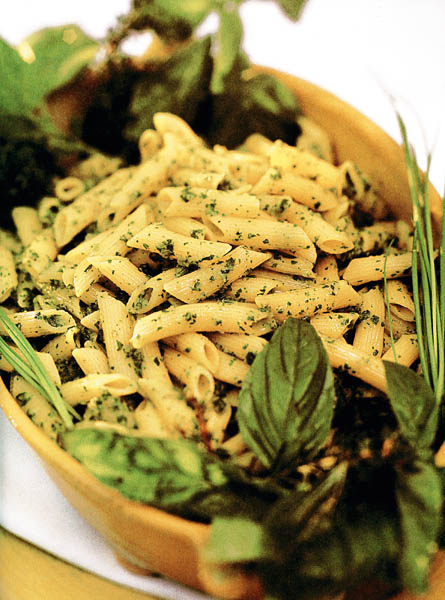 3. Pastele fierte se pun într-un castron suficient de mare, apoi se adaugă sosul de verdeaţă şi se amestecă până se acoperă uniform, cu sos, toată cantitatea de paste. Se acoperă, se lasă 10 – 15 minute şi se pot servi.