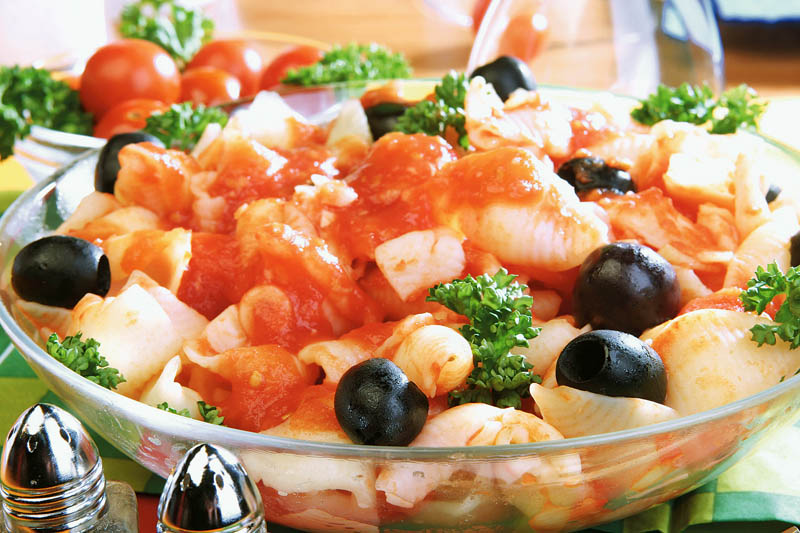 3. Pastele fierte se pun într-un castron şi se amestecă cu 2-3 picături de ulei. Se adaugă sosul de roşii cu măsline şi se ornează cu pătrunjel verde. Se servesc imediat.