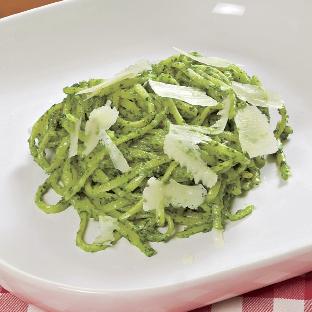2. Într-un mixer, se pune busuiocul şi se toacă la viteză mare. Seminţele de pin se prăjesc la foc mic dacă sunt crude şi se adaugă amestecului, alături de usturoi, parmezan, pecorino şi puţin ulei de măsline (se poate face şi fără pecorino, care se găseşte mai rar la noi). Se mixează la putere mare, asfel încât amestecul să se transforme într-o pastă. După preferinţe, aceasta poate fi mai fină sau tocată mai mare. Treptat, se mai adaugă ulei de măsline, timp în care gustul se echilibrează cu brânzeturi, ulei sau seminţe de pin.