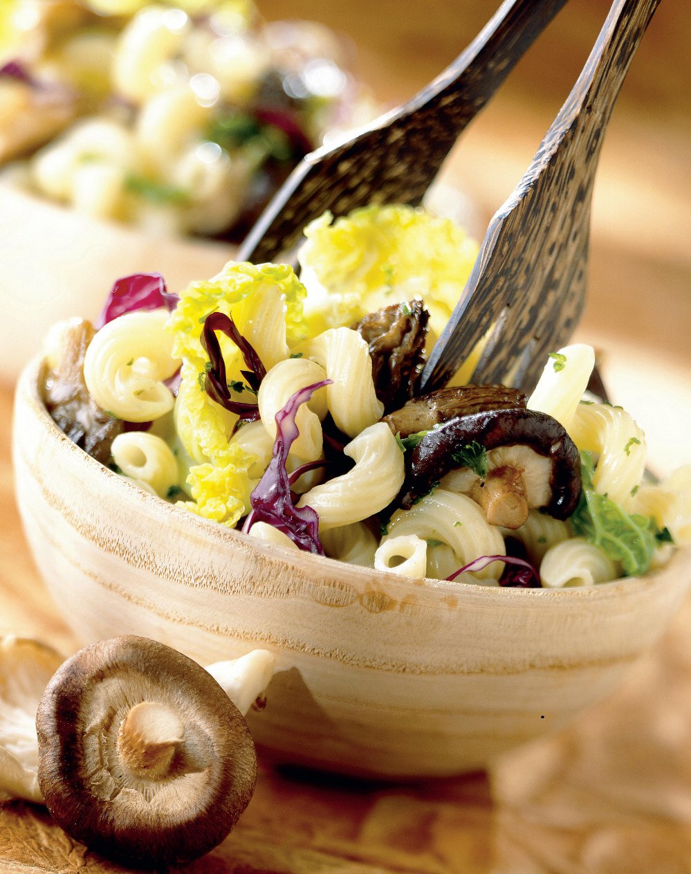 3. Sosul obţinut se amestecă cu pastele fierte în apă sărată cu ulei. Salata obţinută se serveşte rece.