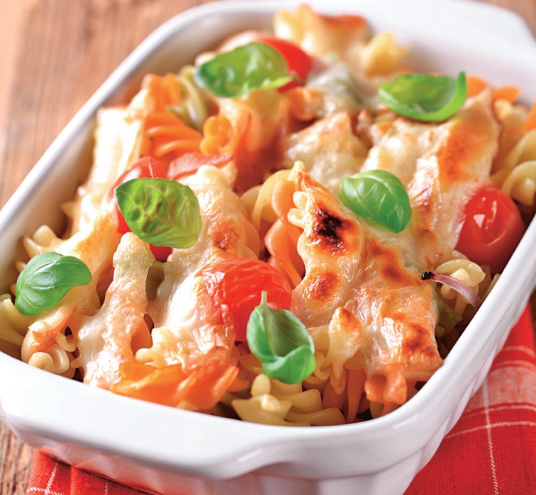 2. Roşiile se taie în două, se amestecă cu pastele şi apoi se pun într-un vas de cuptor.