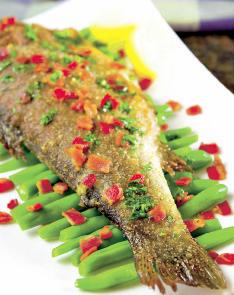 4. Păstrăvii se trec prin mălai şi se prăjesc în uleiul încins. Se scurg de ulei pe un prosop de hârtie şi se servesc pe pat de fasole verde. Pe deasupra, se presară baconul prăjit, felii de lămâie şi pătrunjel.