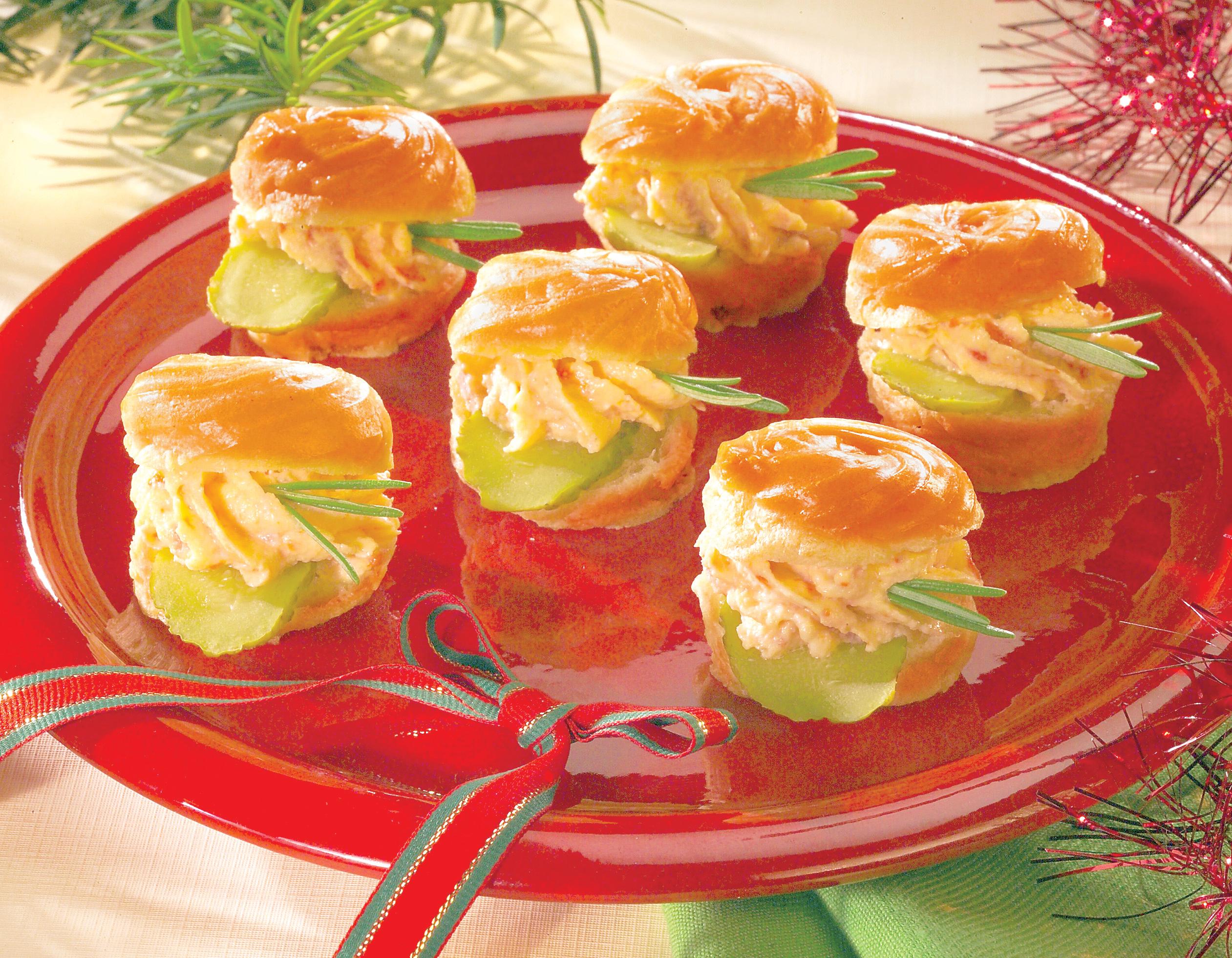 4. Se umple fiecare pateu cu cremă şi se decorează cu rozmarin şi castraveţi muraţi, feliaţi.