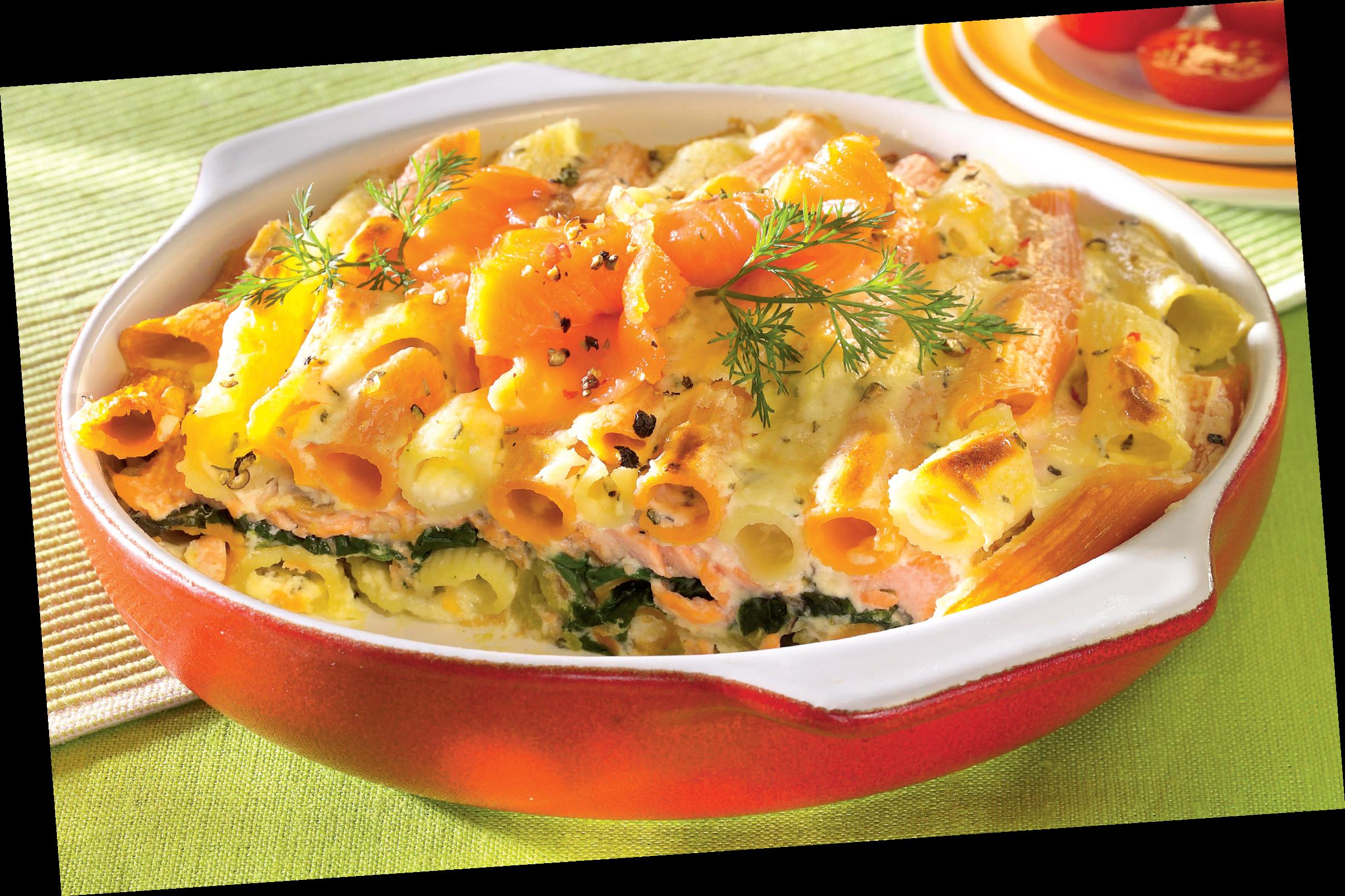 2. Se pune jumătate din cantitatea de paste într-un vas termorezistent şi se acoperă cu spanacul tocat mărunt şi cu feliile de somon. Deasupra se pune restul de paste rămase.