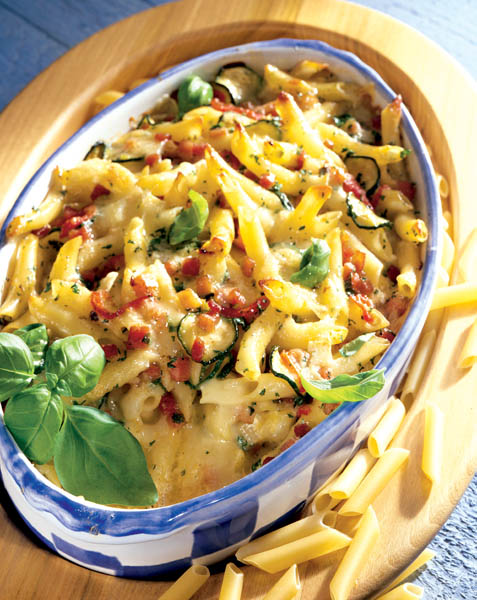 4. După ce s-au scurs pastele, se amestecă cu sosul pregătit, se pun într-o tavă de iena şi se bagă la cuptor. Se lasă să capete o crustă pe deasupra şi se servesc ornate cu frunze de busuioc.