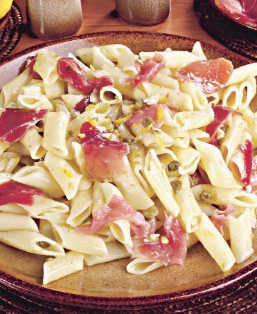 4. Caperele se scot din conservă, se scurg şi se adaugă în bolul cu pastele călite. Se amestecă uşor cu o spatulă specială, ca să nu se rupă şi se aranjează pe un platou. Deasupra se pune prosciutto, se mai presară coajă de lămâie şi se servesc cu un vin alb demidulce.