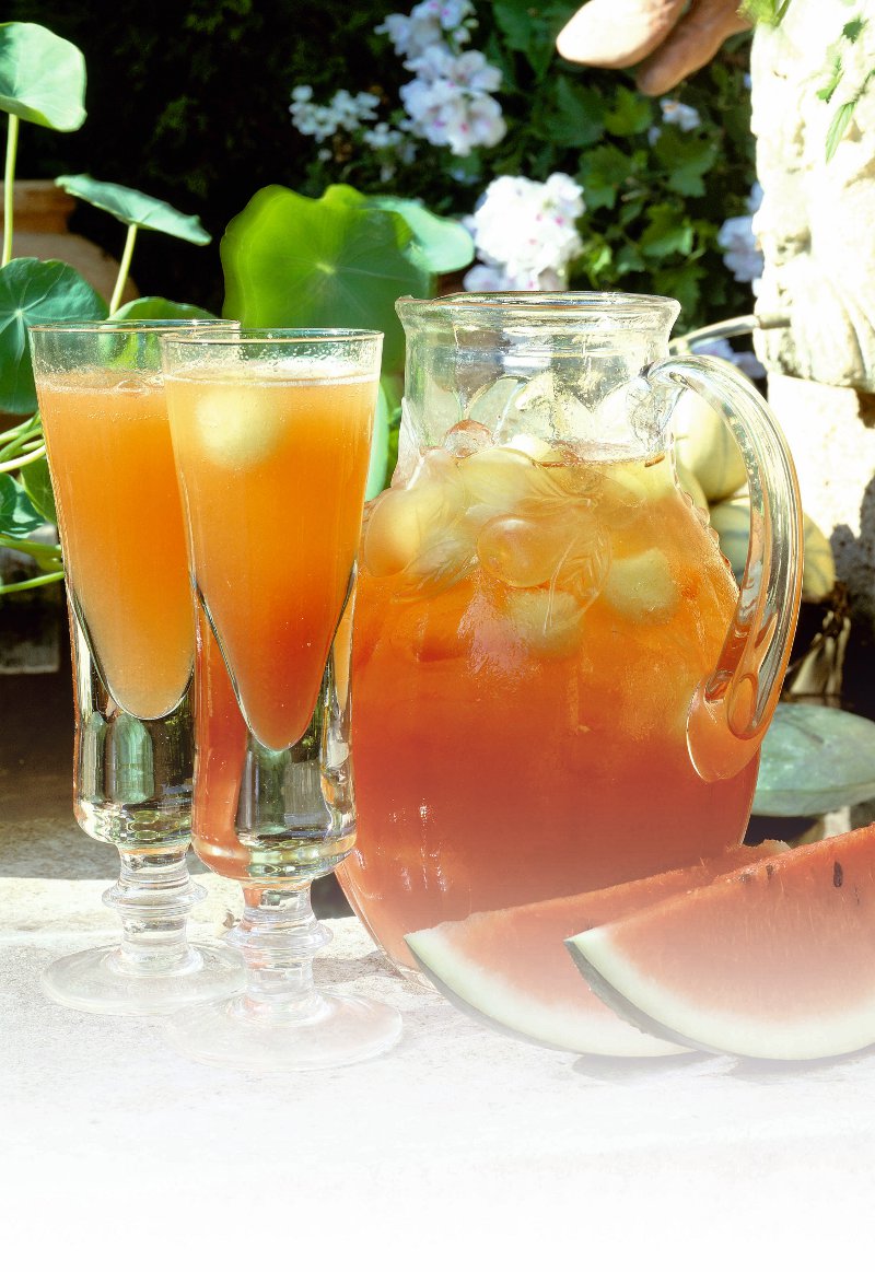 1. Se curăţă pepenele verde de coajă, se taie cubuleţe şi se pune la stors în storcătorul de fructe sau în blender. Într-o crăticioară, se pune zahărul cu 50 ml de apă şi se amestecă pe foc, până când se topeşte, formându-se un sirop. Separat, pepenele galben se curăţă de coajă şi se taie cubuleţe. Jumătate din acestea se pasează în blender. Se toarnă într-o carafă, mai întâi sucul de pepene roşu, apoi cel de pepene galben, siropul de zahăr, cubuleţele de pepene galben şi gheaţa mărunţită. Sucul obţinut este revigorant, fiind ideal pentru după-amiezile călduroase de vară.