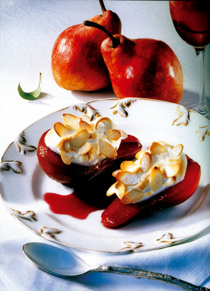 1. Se încălzeşte cuptorul. Perele se spală şi se taie în două. Se curăţă de coajă şi de sâmburi, apoi se pun într-o tavă potrivit de mare pentru 8 jumătăţi de pere.