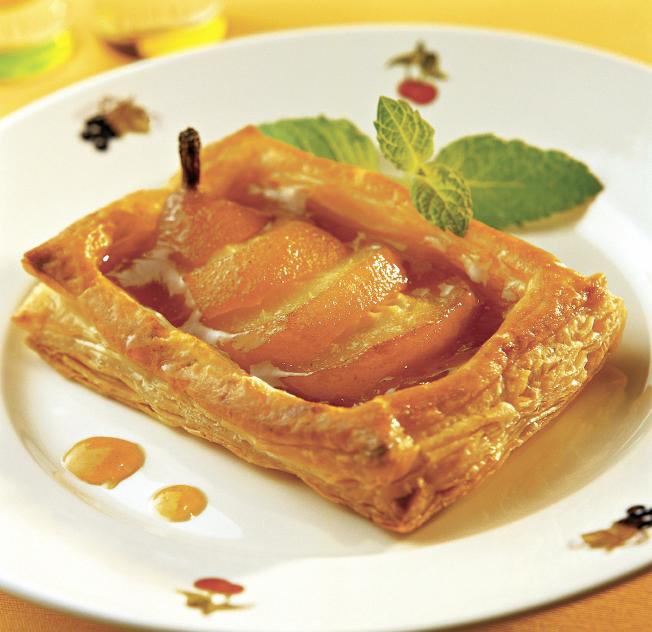 4. Se aranjează feliile de pere după preferinţă şi se bagă la cuptor. După ce a crescut aluatul şi perele au devenit aurii, se scoate tava din cuptor şi, pe deasupra, se toarnă crema caramel. Se lasă să se răcească şi se serveşte ornată cu frunzuliţe de mentă proaspătă.