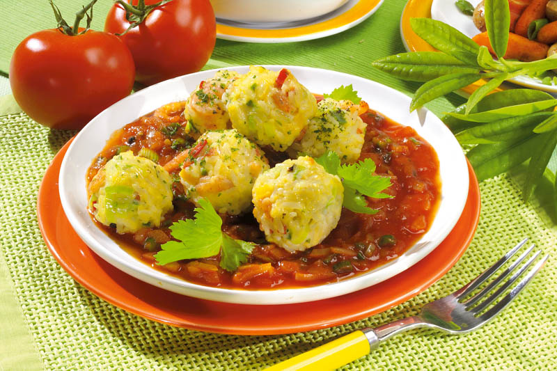 2. Când se răceşte orezul se amestecă cu gălbenuşurile, amidonul, un vârf de cuţit de şofran, un praf de sare, piper şi busuioc. Se formează perişoare, care se fierb într-o oală cu apă şi sare, 5-6 minute. Se scot cu spumiera şi se servesc cu sos de roşii.