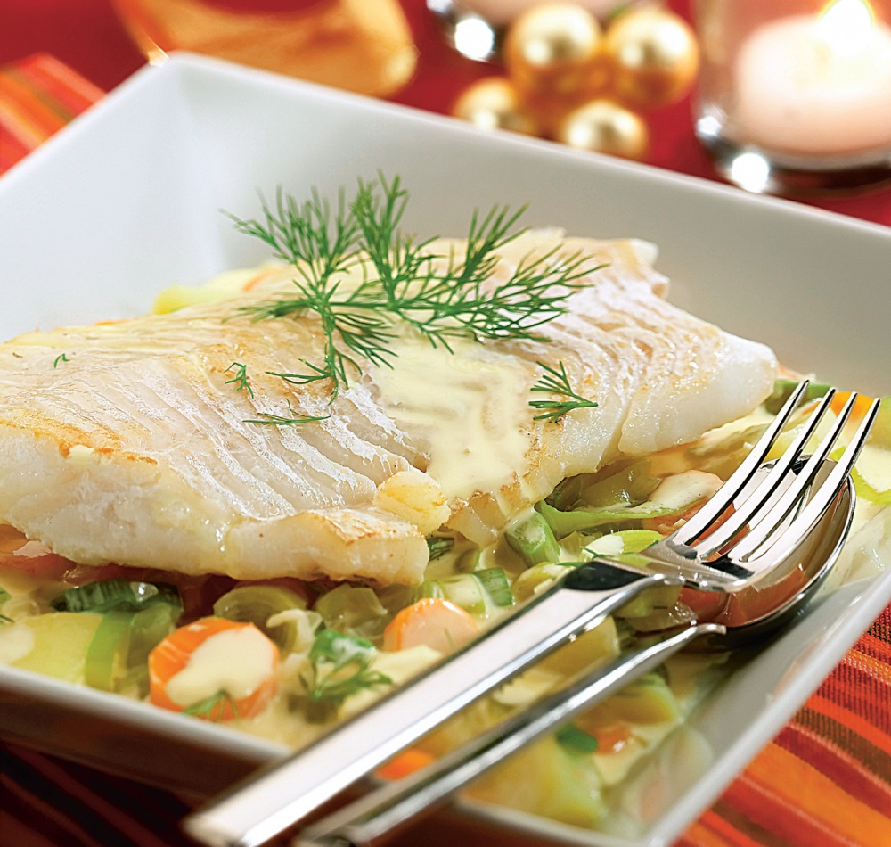 4. În fiecare farfurie se pun legume cu sos, se asaza o bucata de peste deasupra si se aduce la masa cu marar.