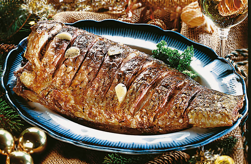 2. Ceapa şi usturoiul se toacă şi se pun într-o tavă unsă cu ulei. Deasupra se pun bucăţile de peşte, care se ung cu ulei. Se adaugă vinul, sucul de roşii diluat cu puţină apă, câteva boabe de piper, sare şi foaia de dafin.