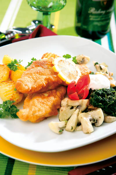 3. Peştele pane se serveşte fierbinte cu lămâie şi garnituri de legume.